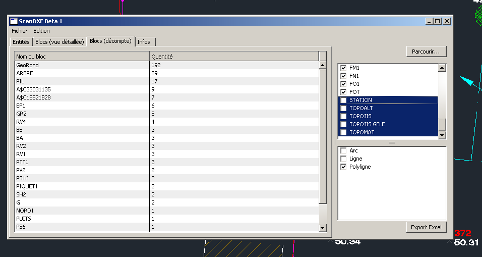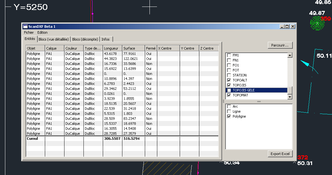 dans ScanDXF, vous pouvez filtrer les résultats par type d'objet et/ou par calque, trier par colonne...