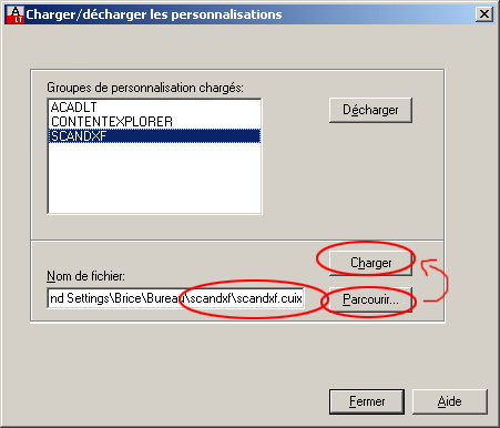 - charger le menu partiel scandxf.cuix (depuis la boîte de dialogue CUI, ou avec la commande CHARGIUPERSO).